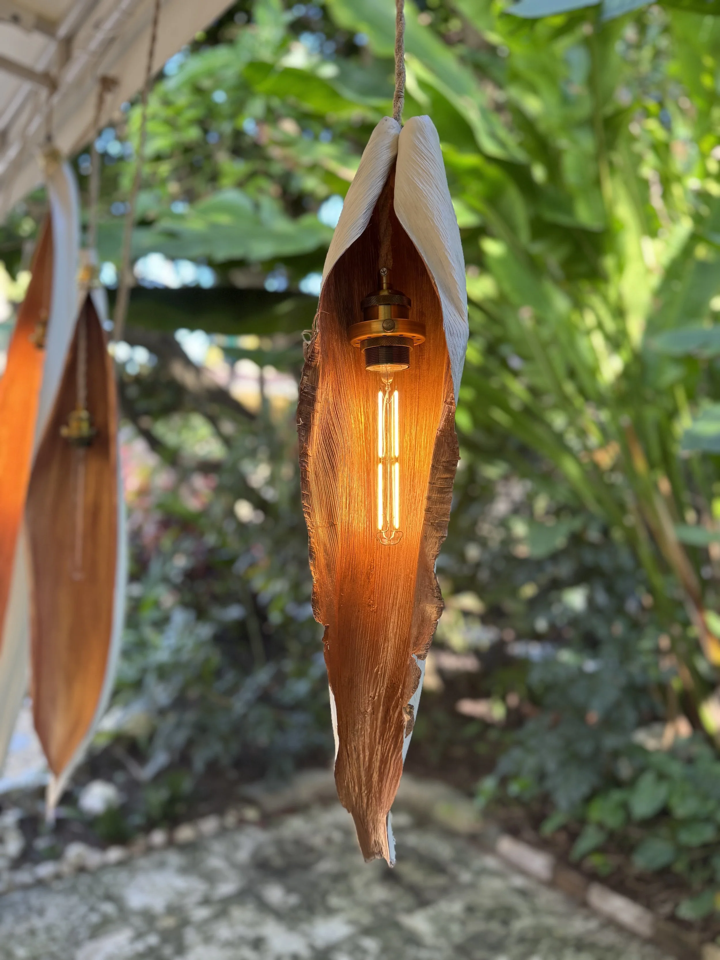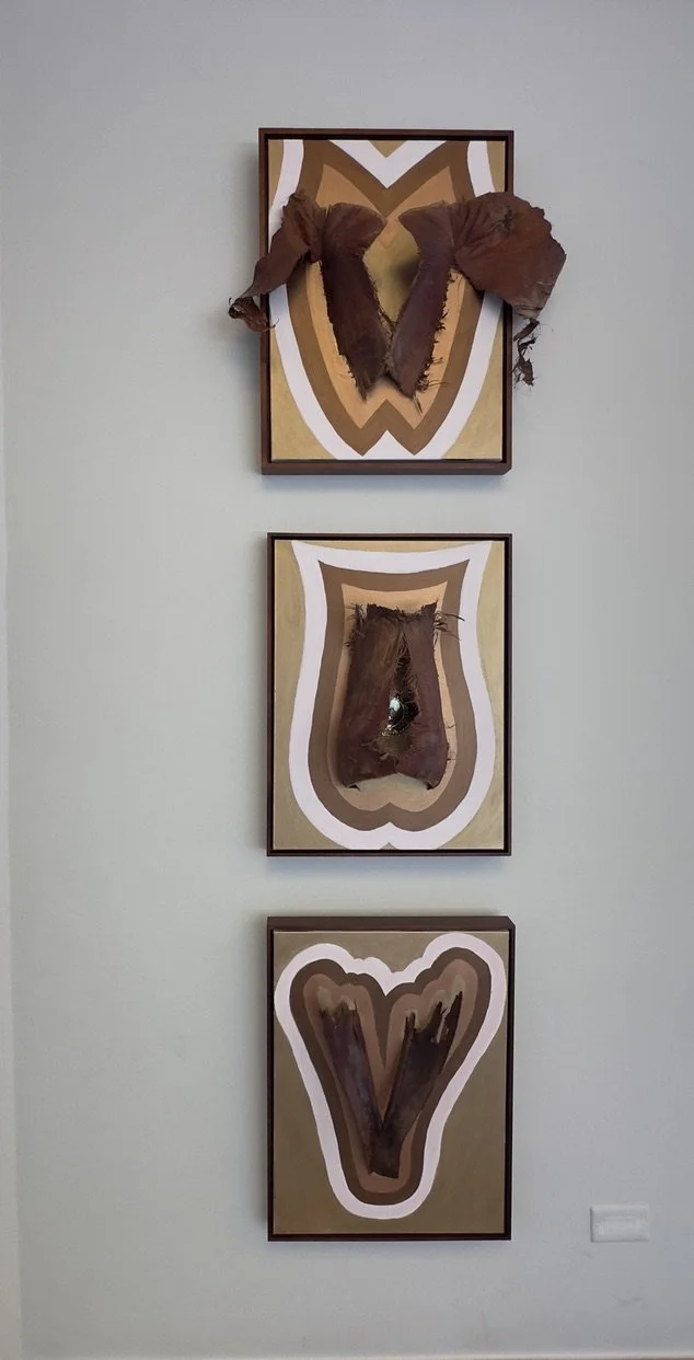 Throughout her work, deliberate contradictions emerge. Mirrors positioned at unexpected angles invite reflection while questioning vanity while her light fixtures, sculptures, and vessels—crafted from tree parts—are transformed with layers of paint, acrylic, wax, resin, and brass, blurring boundaries between organic and manufactured, art and function. These works are not trapped behind glass; rather, in an effort to retain some original freedom, they swing from decorative chains or float within frames that attempt to contain them.